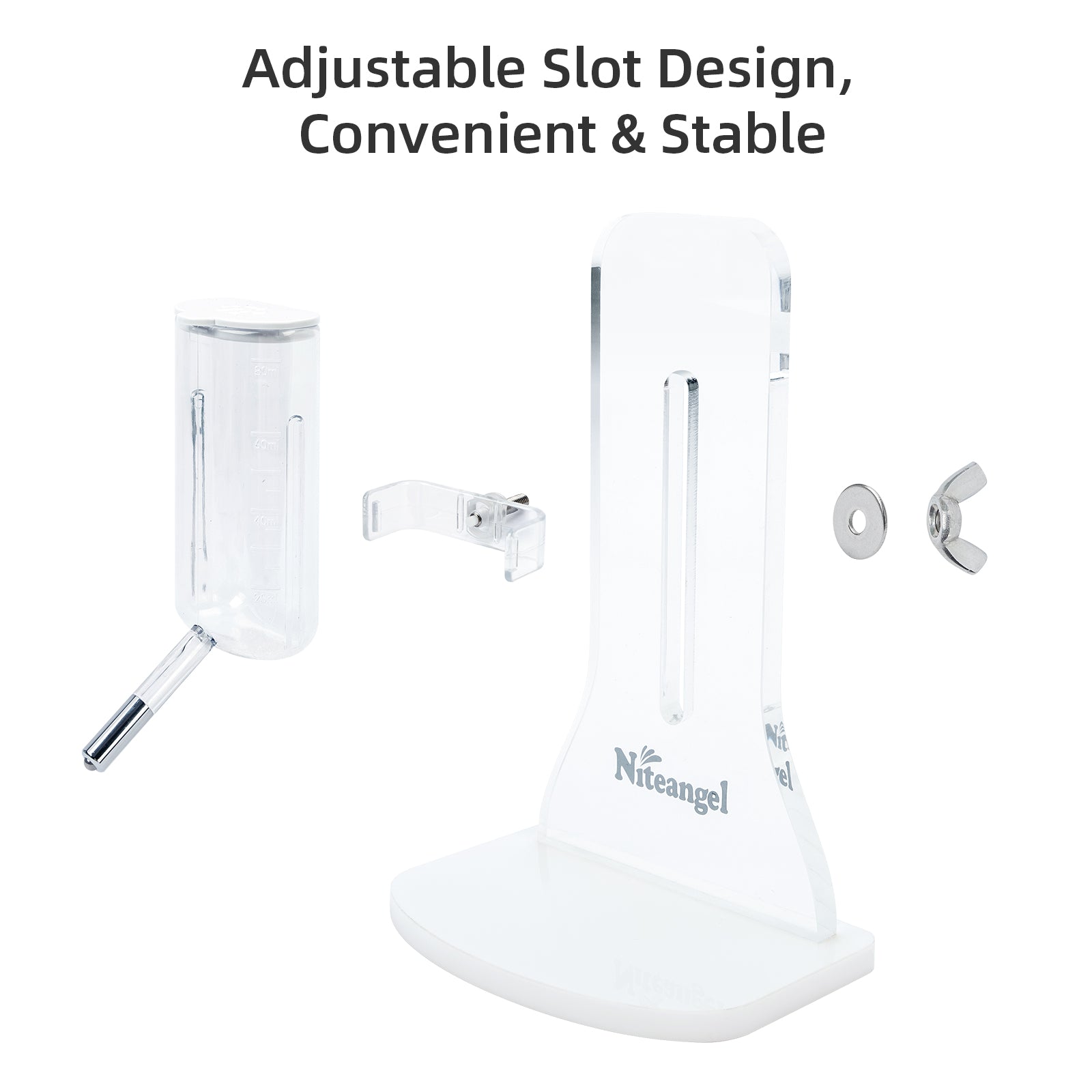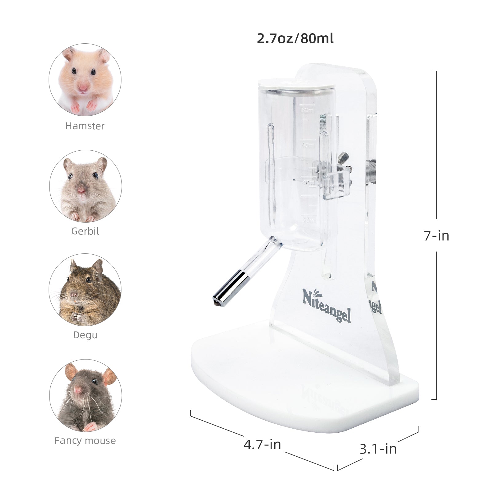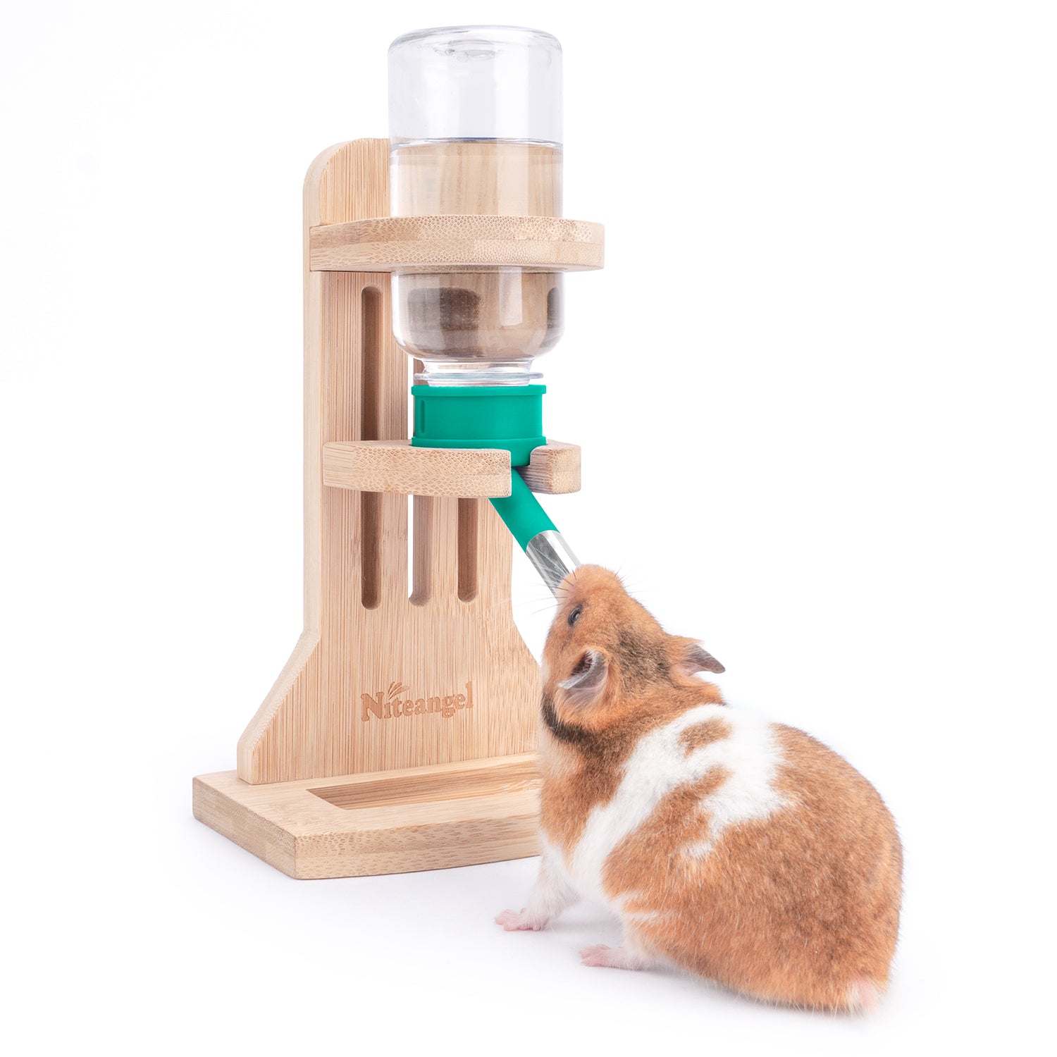 Le Support en bois pour bouteille d'eau est en bambou, équipé d'une bouteille d'une capacité de 120 ml, qui permet de conserver environ 1 à 2 semaines d'eau pour un hamster syrien. La conception à double boule peut efficacement empêcher l'eau de fuir. La hauteur et le débit d'eau réglables peuvent rendre votre hamster plus confortable lorsqu'il boit de l'eau.