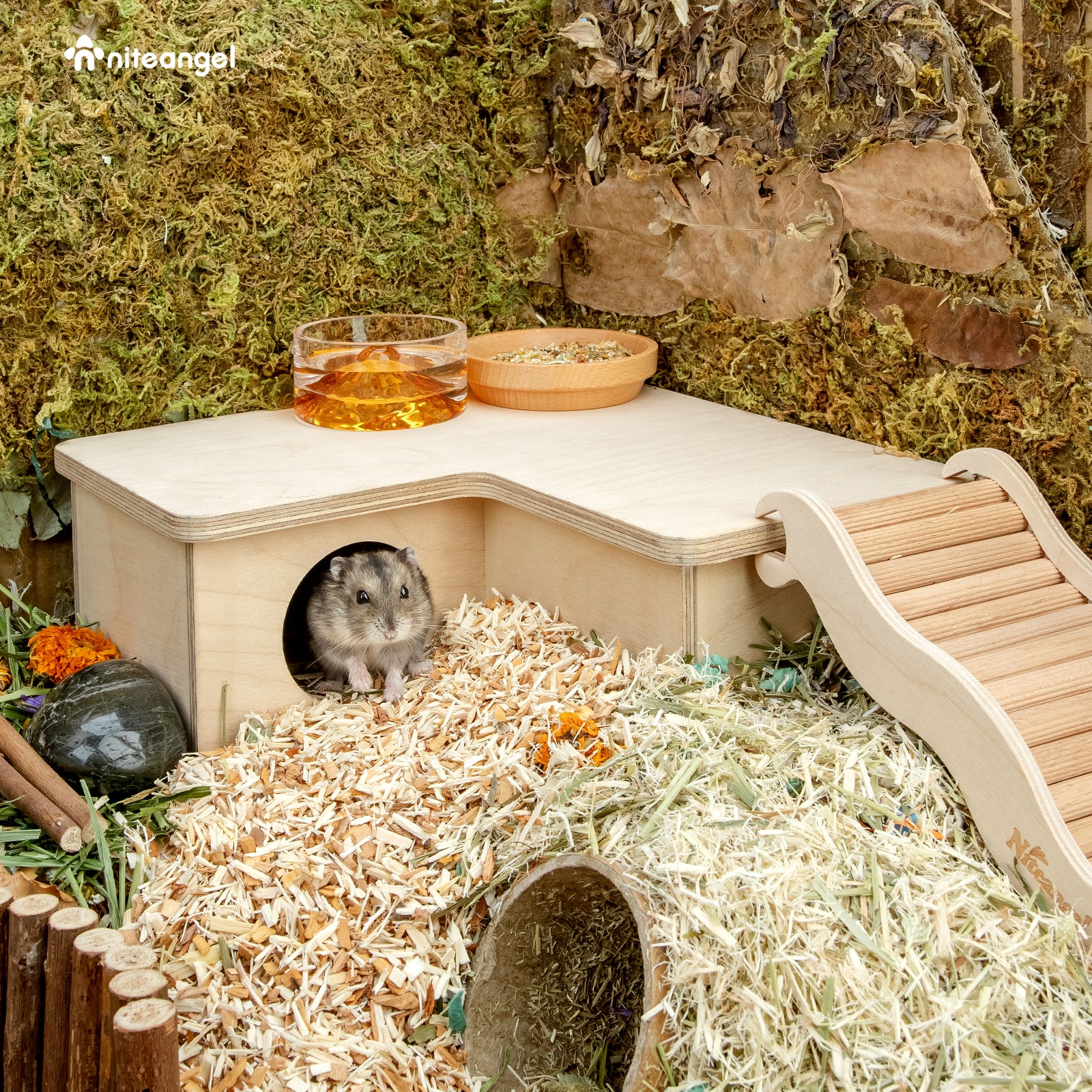 In the wild the hamster usually have multiple chambers and each one has its specific use. The Wooden Multi-Chamber Hideout comes without bottom, which allows the hamster to burrow deep down, therefore mimics how a hamster would live in the wild and gives your hamster a place to feel safe. There are multi-chamber, three-chamber and two-chamber to choose. In order to achieve the balance upon the bedding, you can also pick the support sticks to heighten the hideout.